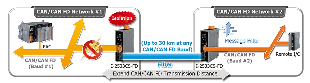 The I-2533CS-FD is a local CAN/CAN FD (CAN with Flexible Data-Rate) bridge used to establish a connection between two CAN bus systems via single mode fibre optic transmission medium. In order to solve the problem between CAN/CAN FD and fibre transmission, the I-2533CS-FD is specially designed for converting the electrical CAN/CAN FD bus signal to fibre optic cables.